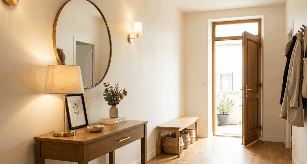 L’entrée donne le ton. C’est elle qui accueille, qui ouvre la circulation, qui crée la première impression. Dans de nombreuses approches feng shui, la porte d’entrée est considérée comme un point important, car c’est par elle que “l’énergie” entre dans la maison. Même sans adhérer à cette vision au pied de la lettre, on comprend très bien l’idée : une entrée encombrée, sombre ou mal pensée rend tout le logement plus confus dès les premières secondes.